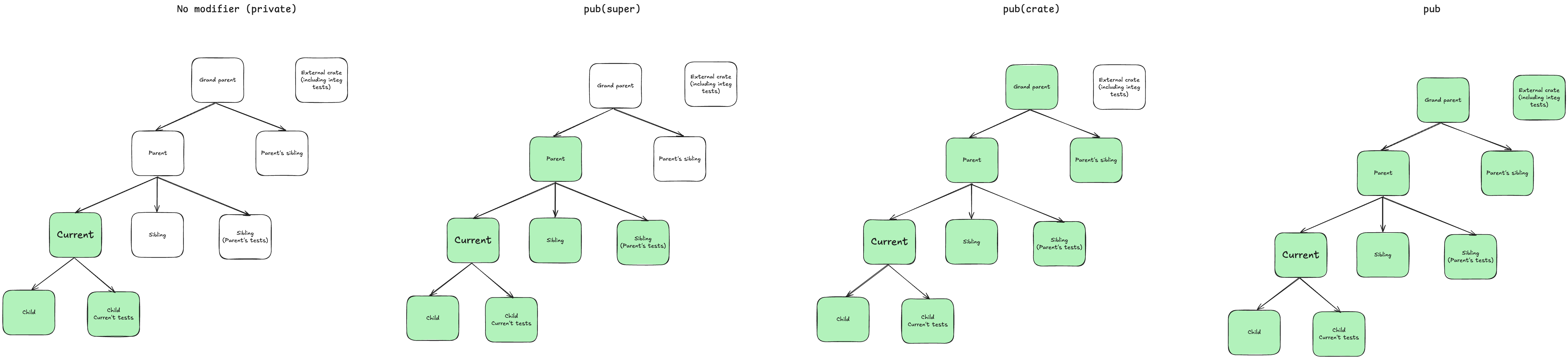 pub(super)pub(crate)pubEach access modifier influences the scope of the symbol as shown below.